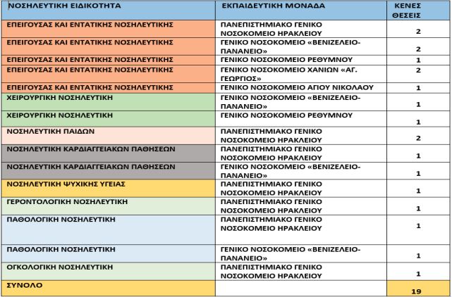 Η 7η Υγειονομική Περιφέρεια Κρήτης ανακοινώνει την πρόσκληση για την κάλυψη 19 θέσεων ειδικευόμενων νοσηλευτών για τις νοσηλευτικές ειδικότητες α) Επείγουσας και Εντατικής Νοσηλευτικής, β) Χειρουργικής Νοσηλευτικής, γ) Νοσηλευτική Ψυχικής Υγείας δ) Γεροντολογική Νοσηλευτικής ε) Παθολογικής Νοσηλευτικής, στ) Ογκολογικής Νοσηλευτικής, ζ) Νοσηλευτική Παίδων και η) Καρδιαγγειακών Παθήσεων. Οι θέσεις ανά νοσηλευτική ειδικότητα και εκπαιδευτική μονάδα έχουν ως ακολούθως :